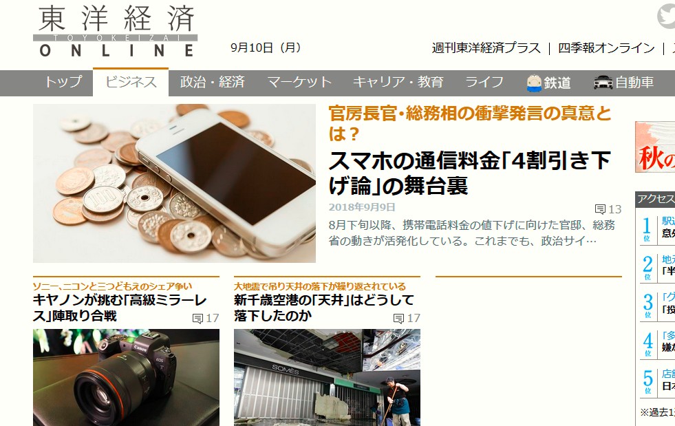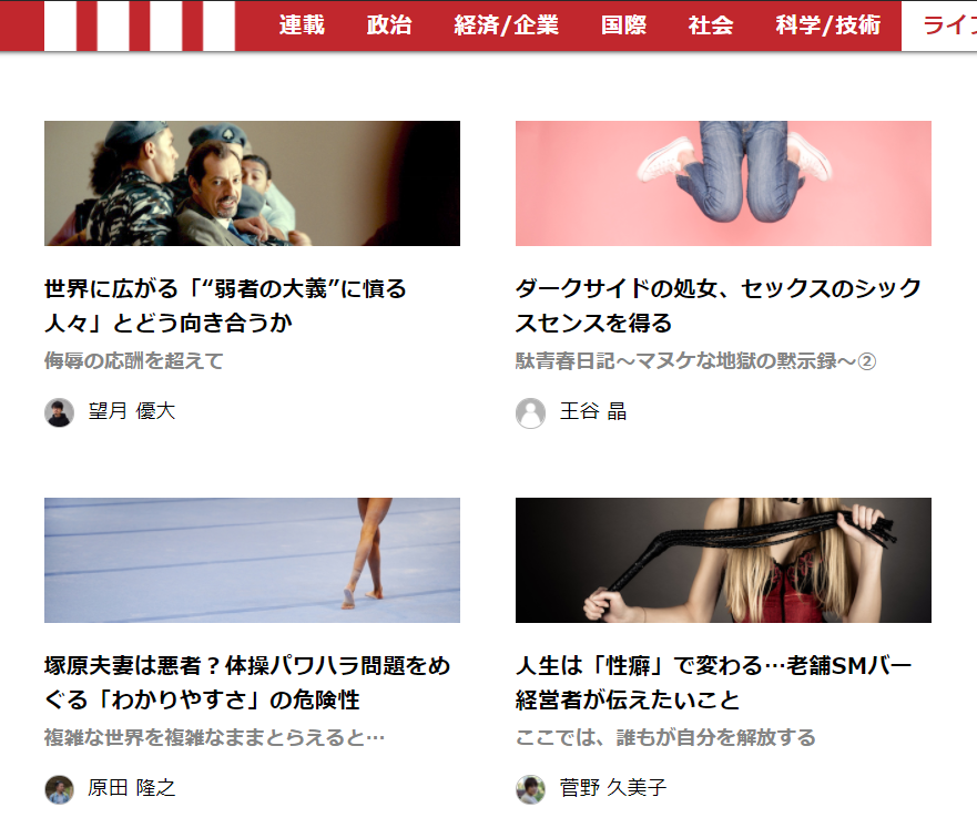 Gendai Business fait un peu de tout en réalité : actualité nationale et internationale, économique, politique etc. Mais je l'aime particulièrement pour ses articles sur la société japonaise, et je ne lis pratiquement que cette section chez eux d'ailleurs. Les articles sont intéressants, recherchés, pas trop difficiles à lire (cela dépend du journaliste évidemment) et ils offrent une vision assez ouverte et critique sur la société japonaise.