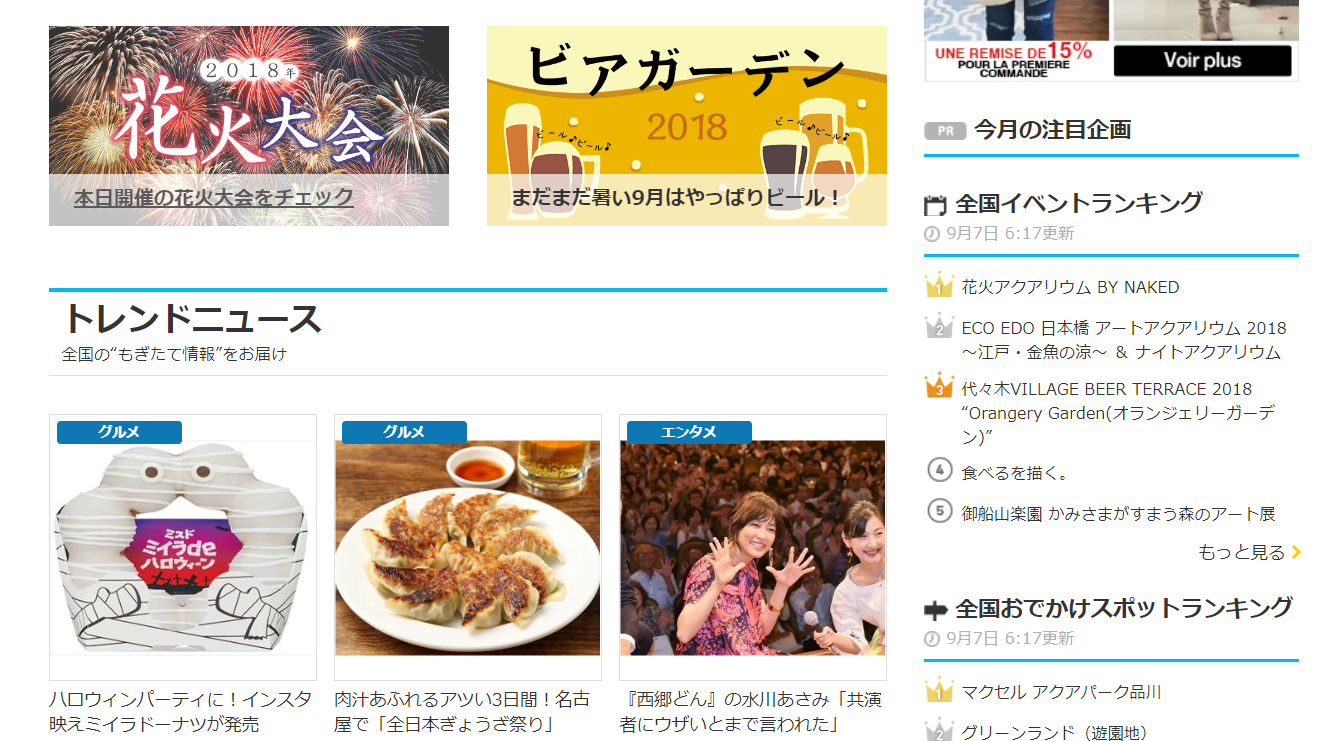 Walker+ est consacré aux évènements et bons plans sur l'ensemble du territoire japonais. Ce n'est pas un site de voyage à proprement parler, mais il donne des idées de sorties originales et des bons plans sur des destinations gourmandes ou pour des omiyage en édition limitée. Ils adorent faire des articles sur les matsuri et les feux d'artifice (à notre plus grand bonheur). Vous pouvez choisir la région que vous voulez et ensuite jouer avec le calendrier pour avoir les évènements sur une période donnée.