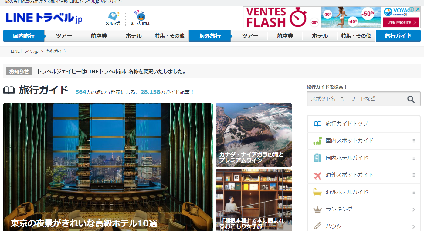 Désormais fusionné avec Line Travel, Travel.jp reste quand même une référence dans le domaine du tourisme aussi bien national qu'international. Le site est à la base un site de réservation, mais il possède une grande partie "guide de voyage" (旅行ガイド) avec des conseils et surtout des destinations insoupçonnées (avec des photos magnifiques qui vous donnent qu'une envie : chopper votre appareil photo et prendre l'avion). Le site est simple à utiliser avec des thématiques : voyage entre filles, sorties onsen, voyages gourmet... et par villes. Il offre aussi des fois des bons plans et promotions.