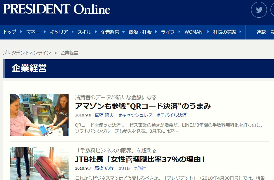 J'entretiens un rapport assez particulier avec le President car je peux aussi bien aimer ses articles, que les détester. C'est d'un extrême à l'autre : soit ils sont trop complexes et inintéressants, soit ils sont très intéressants et compréhensibles - moyennement recherches et dico à portée de mains. Son approche diffère du Toyo Keizai car il donne la parole à des dirigeants d'entreprises (petite, moyenne ou grosse d'ailleurs), et il enquête sur des entreprises et des secteurs d'activités (tendances, big news etc). Le President consacre aussi des articles sur la carrière professionnelle et le style de vie. Une section destinée aux femmes est assez présente, avec des articles plus ou moins pertinents.